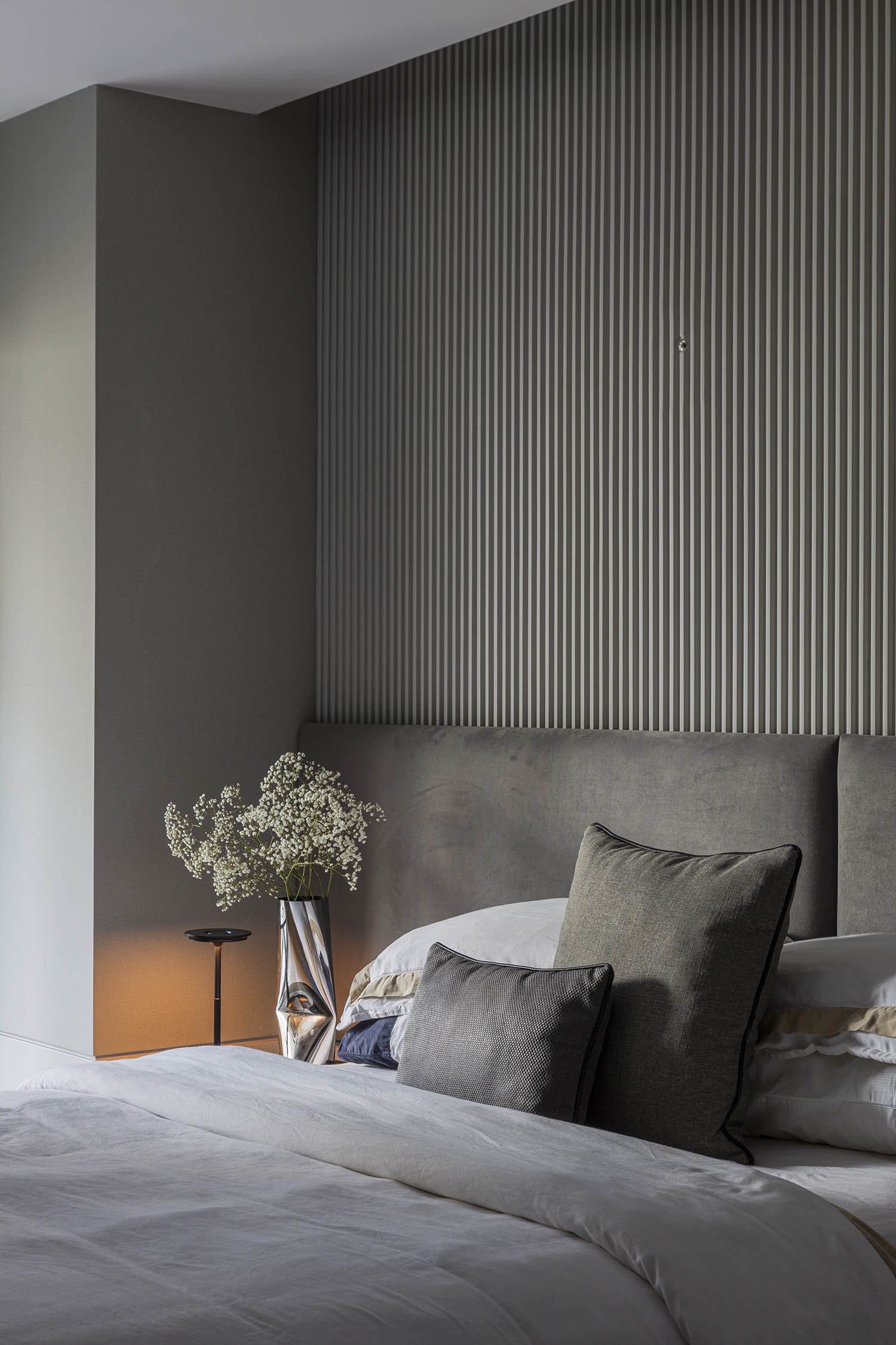 Projetar um apartamento para uma família é mais do que distribuir funções — é transformar o cotidiano em matéria construída. No projeto Frassino, essa missão ganha forma com a fluidez como linguagem. O nome, que vem do quartizito homônimo que reveste piso e paredes, conduz a materialidade do espaço. Seus veios lineares costuram a planta com continuidade visual e tátil, dissolvendo limites e ampliando a percepção dos ambientes.