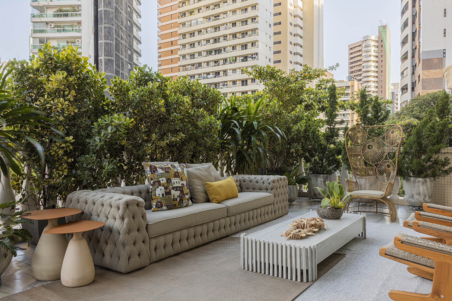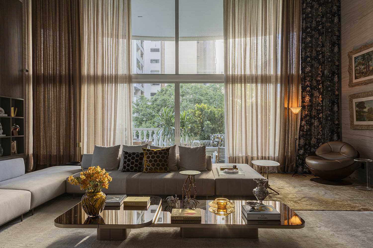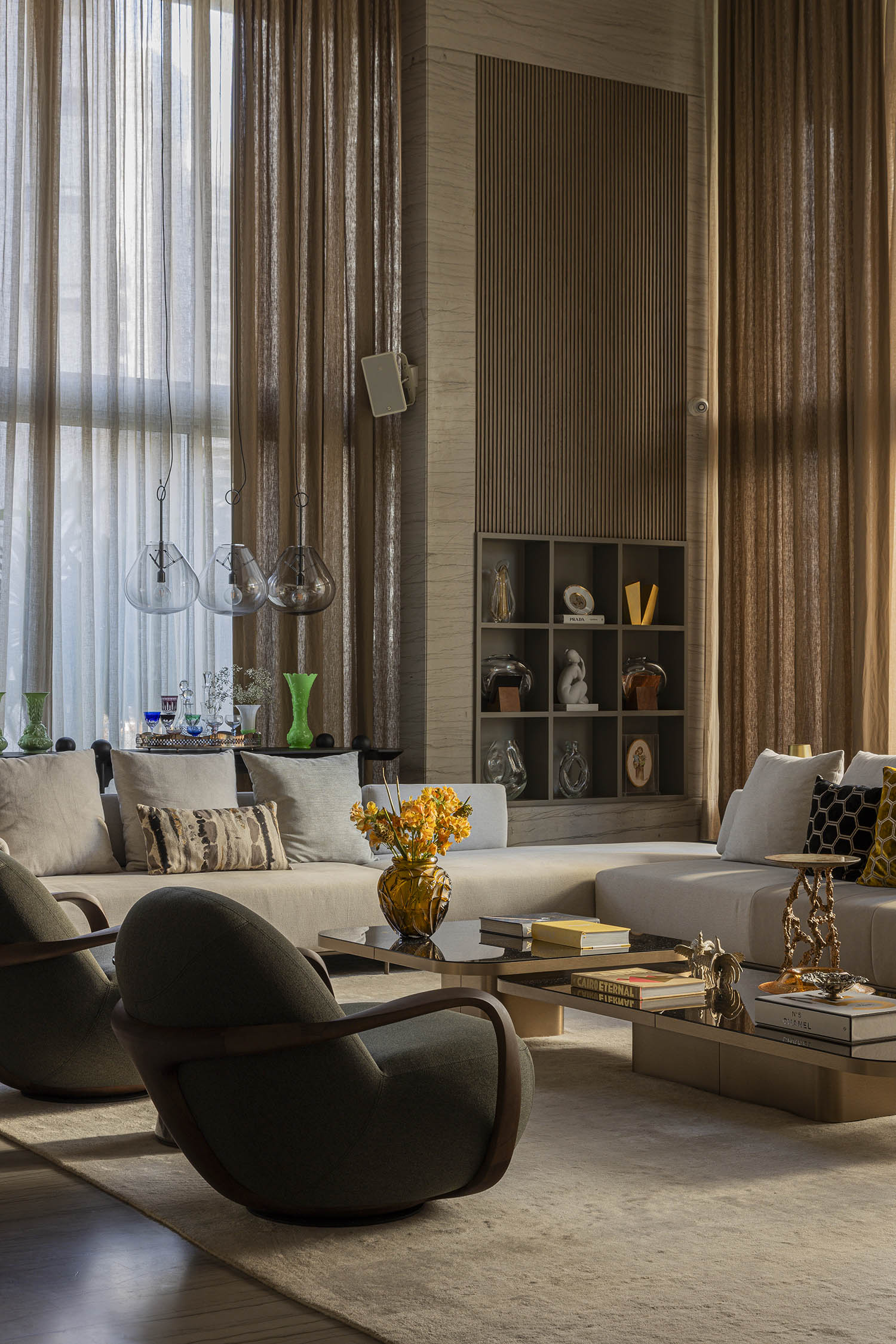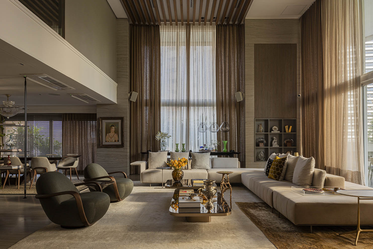Na sala de pé-direito duplo, tons beges e crus acolhem o pôr do sol de Fortaleza, criando uma atmosfera serena. A luz natural interage com os materiais, destaca texturas e gera reflexos sutis que mudam ao longo do dia.