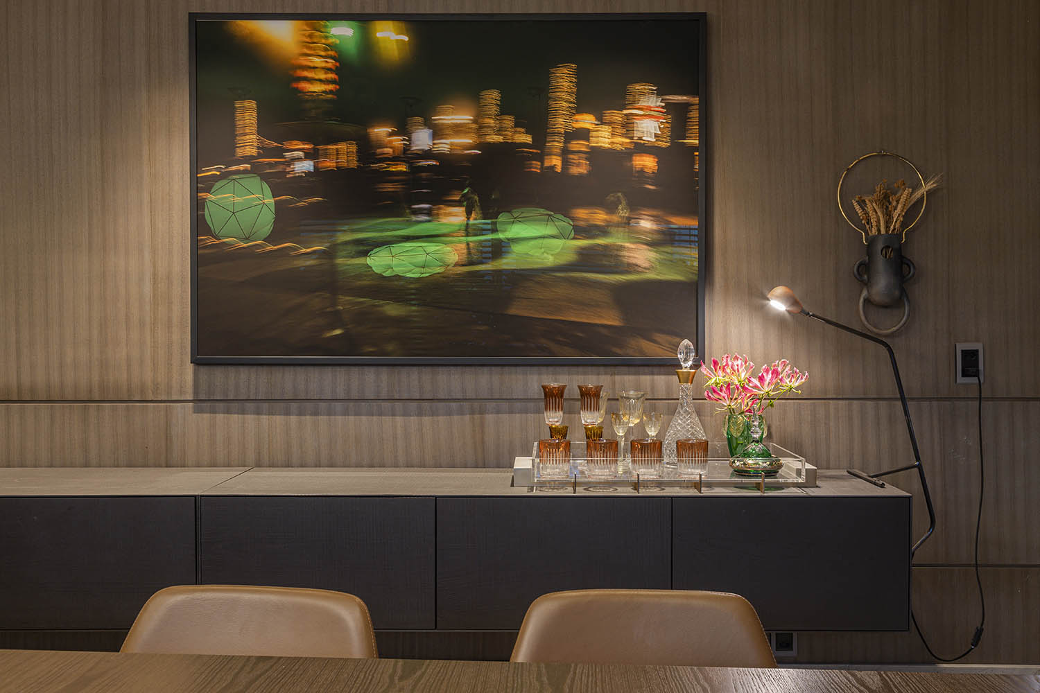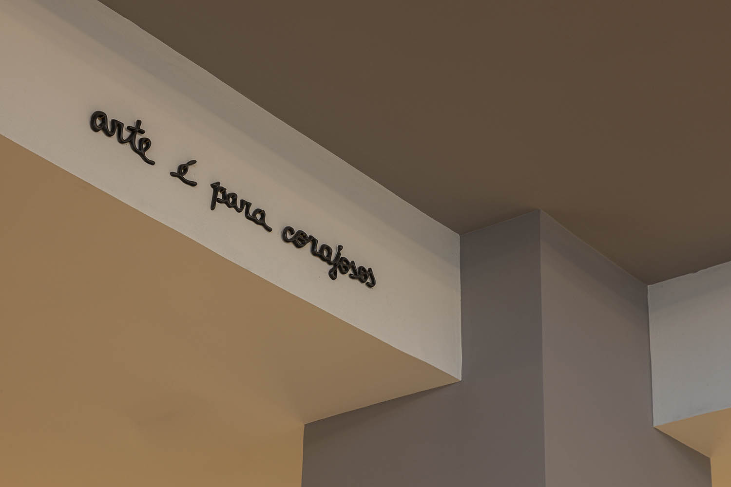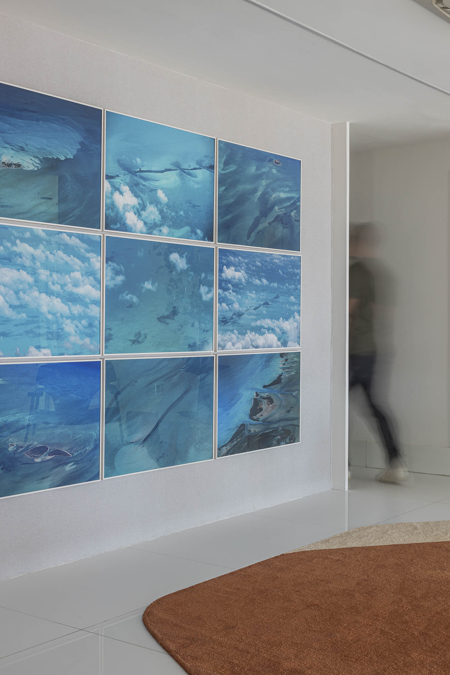 A arquitetura, serena e contida, abre espaço para que a arte e a paisagem conduzam a experiência. A vista da orla da Beira Mar, revelada entre o skyline, é como uma pintura viva emoldurada pelas aberturas. É nesse compasso entre interior e exterior que o projeto estabelece sua poética.