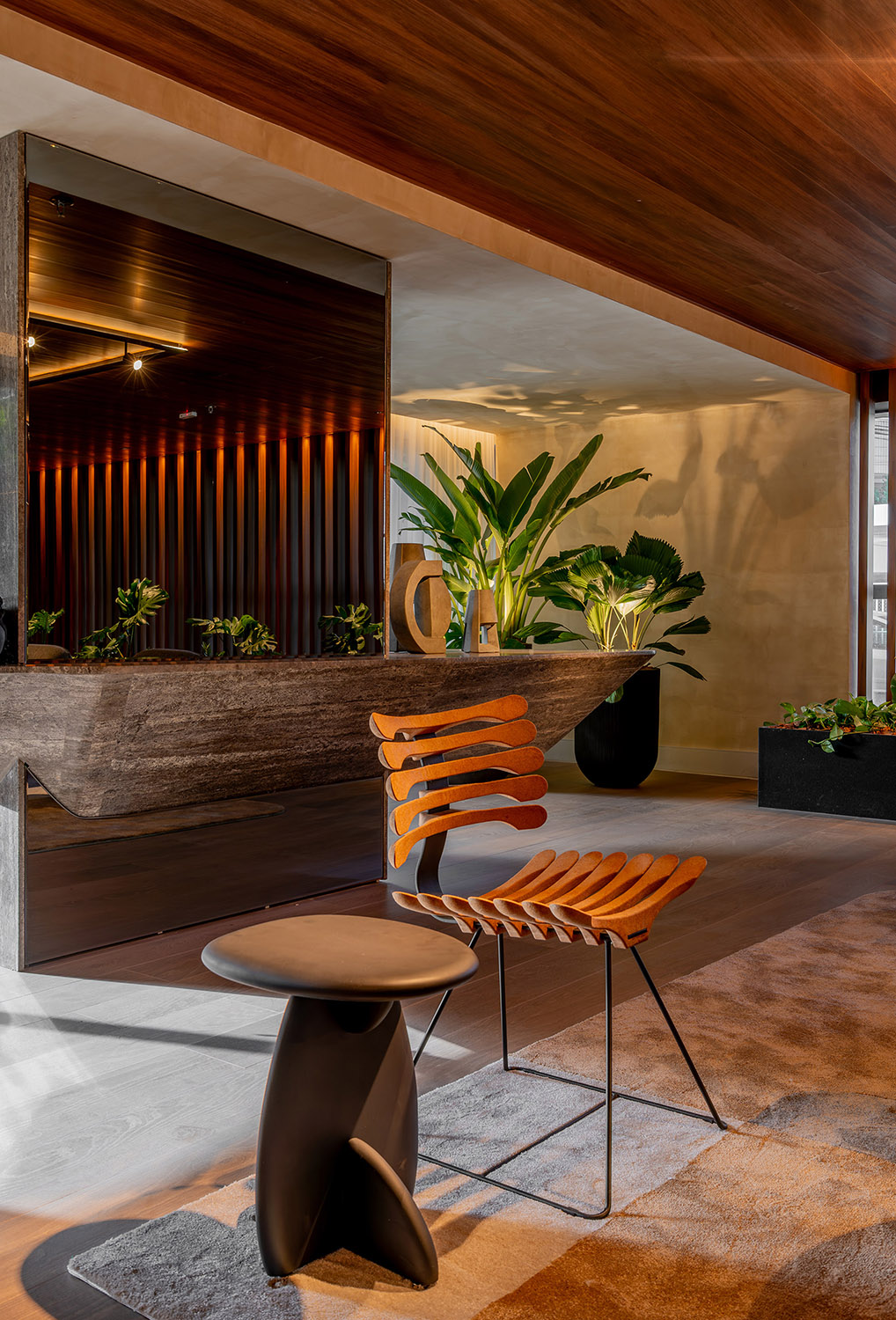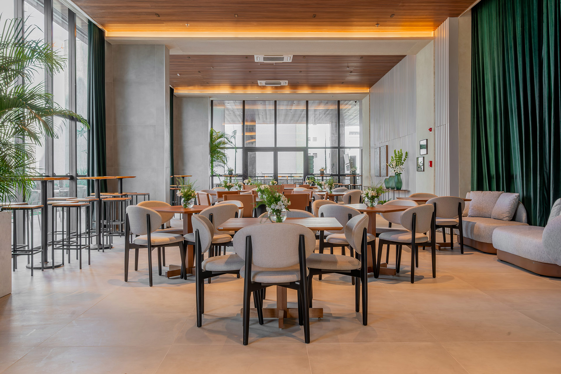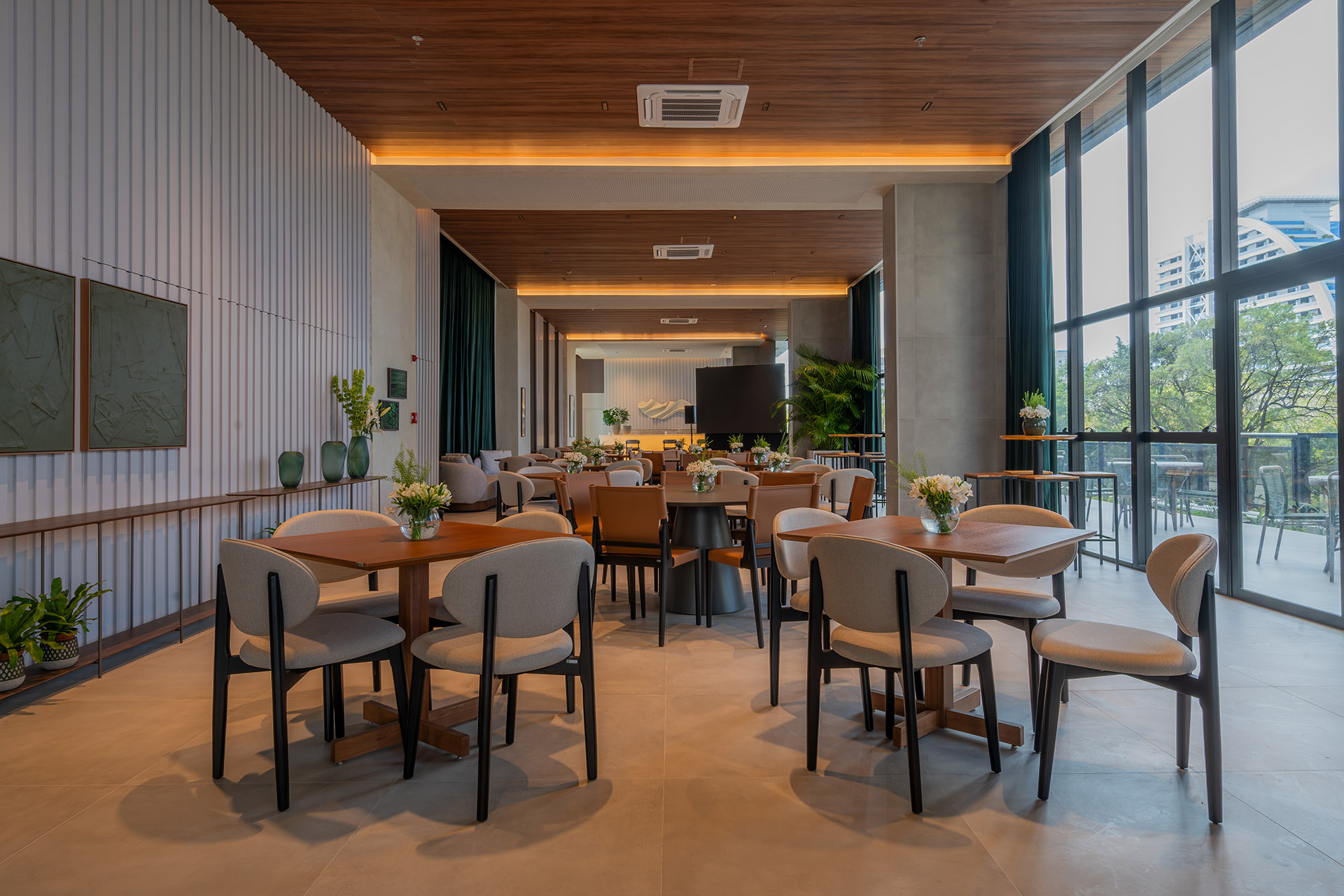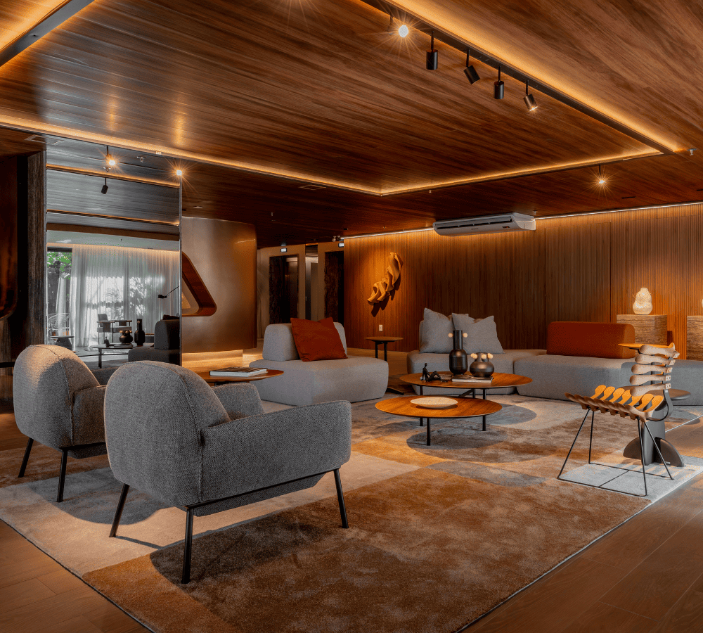 O projeto de interiores das áreas comuns do BS Flower foi planejado para refletir o conceito do empreendimento: charme. Inspirado pela atmosfera da Praça das Flores, o design remete a espaços públicos acolhedores, com materiais que dialogam com a vegetação e os passeios da região. A integração entre o natural e o construído cria ambientes que convidam à permanência e ao convívio.