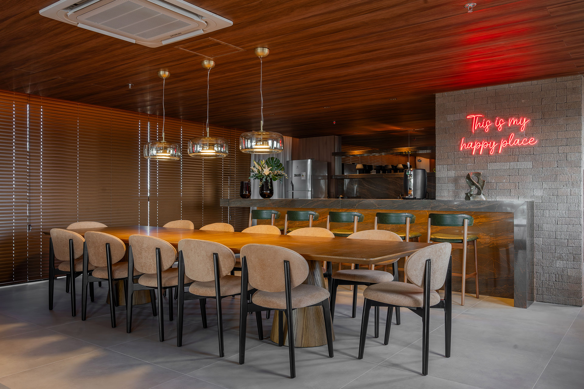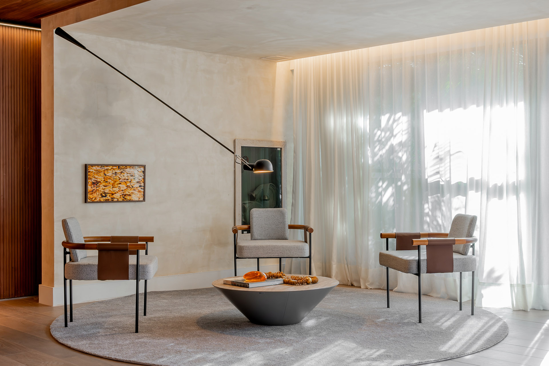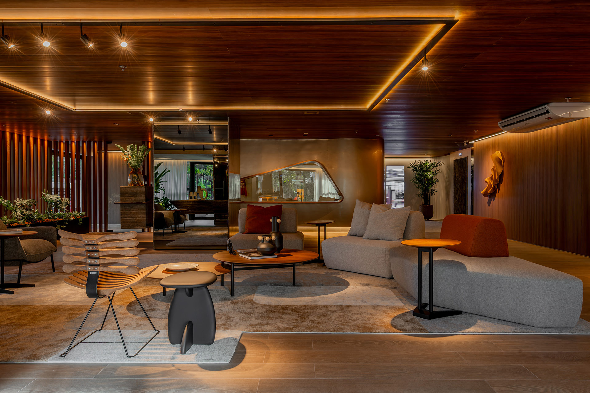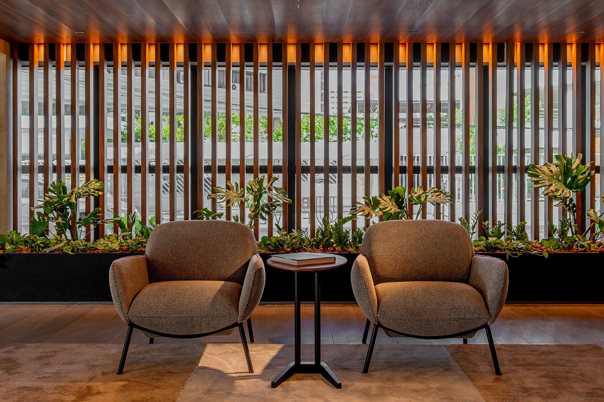 O projeto de interiores das áreas comuns do BS Flower foi planejado para refletir o conceito do empreendimento: charme. Inspirado pela atmosfera da Praça das Flores, o design remete a espaços públicos acolhedores, com materiais que dialogam com a vegetação e os passeios da região. A integração entre o natural e o construído cria ambientes que convidam à permanência e ao convívio.