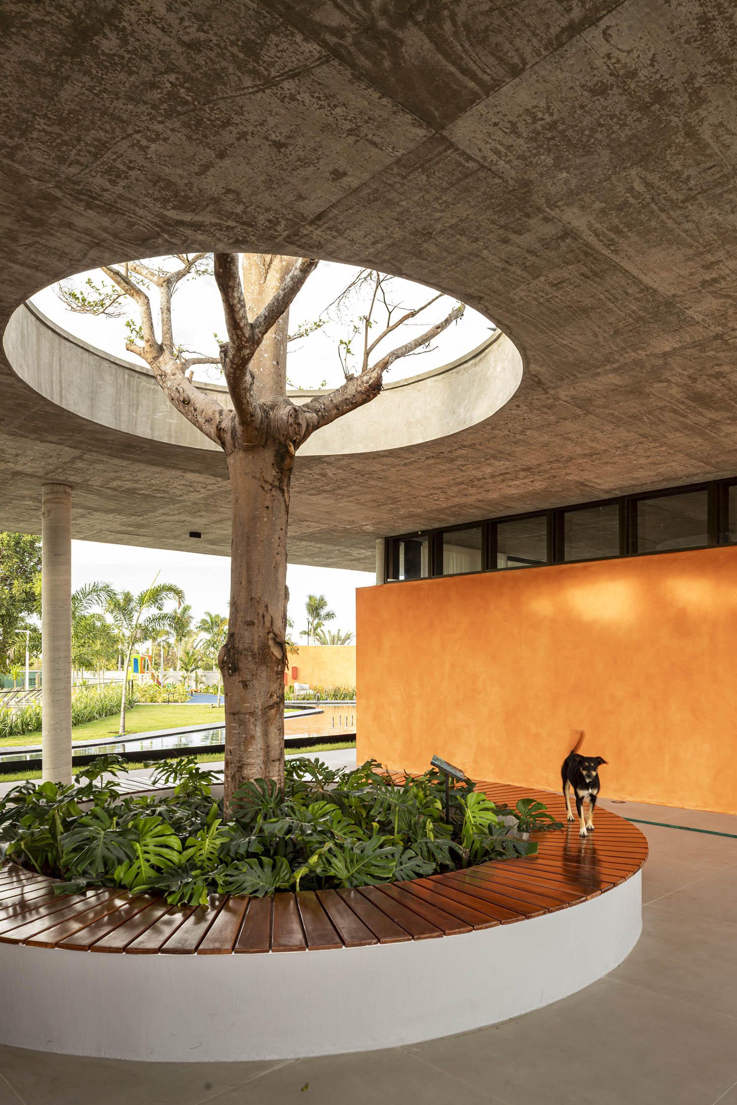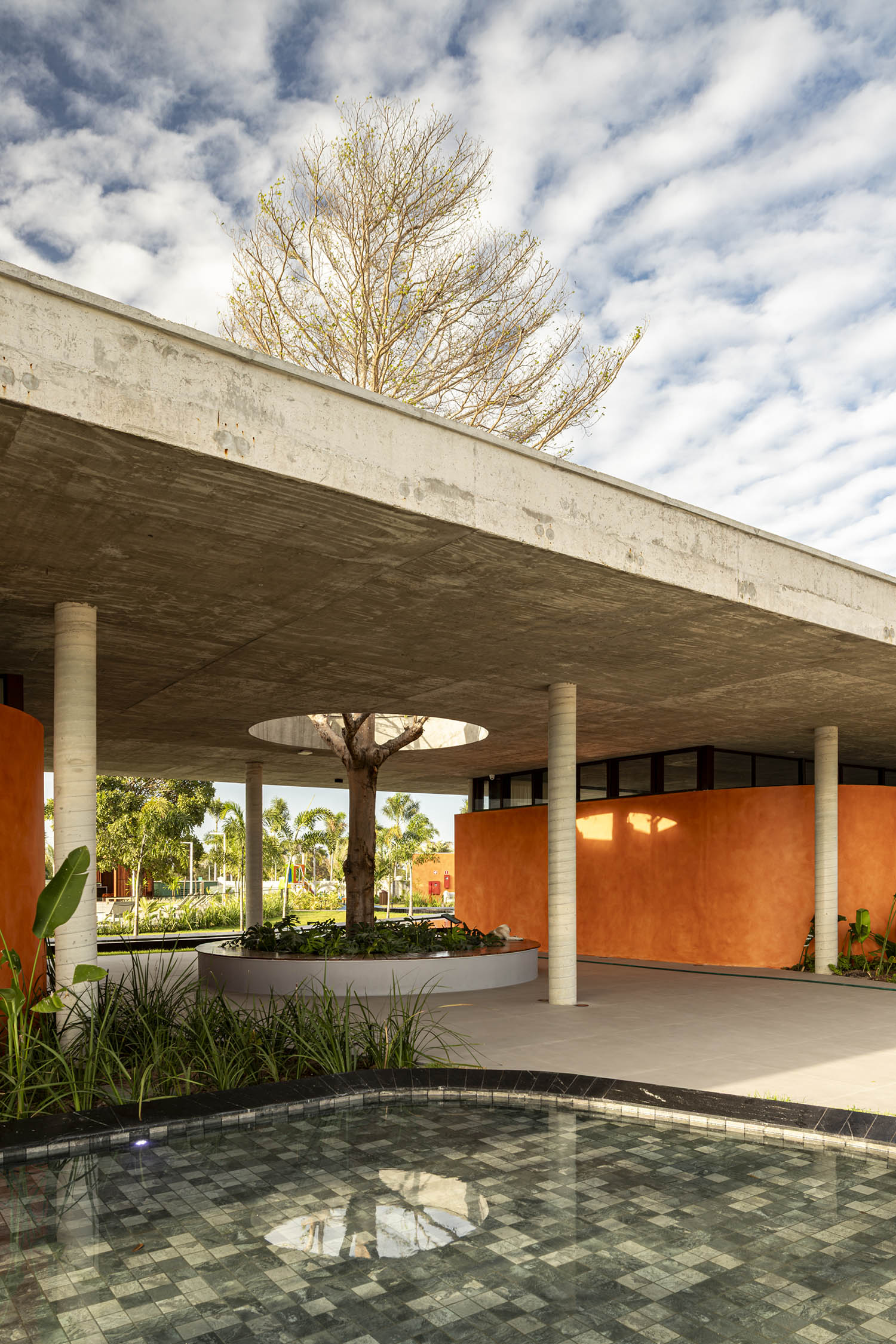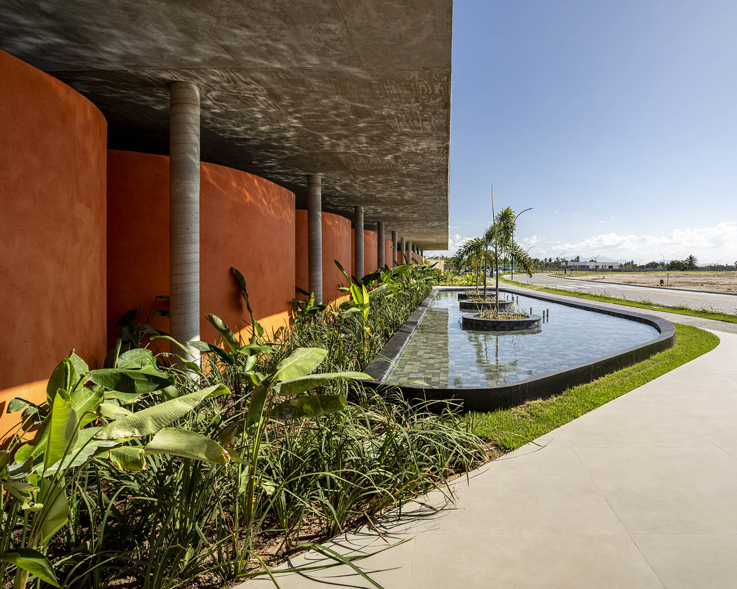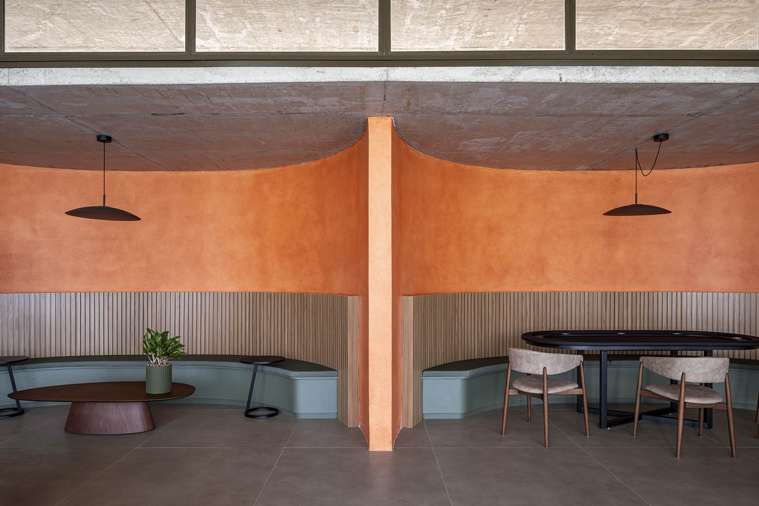 No Clube, a laje ortogonal em concreto aparente é o grande gesto: flutua leve sobre a própria massa. Sob ela, paredes sinuosas costuram os pilares, unindo vedação e estrutura em um movimento contínuo. A cor terrosa reforça a narrativa, evoca o solo nordestino e amplia o vínculo com o entorno.