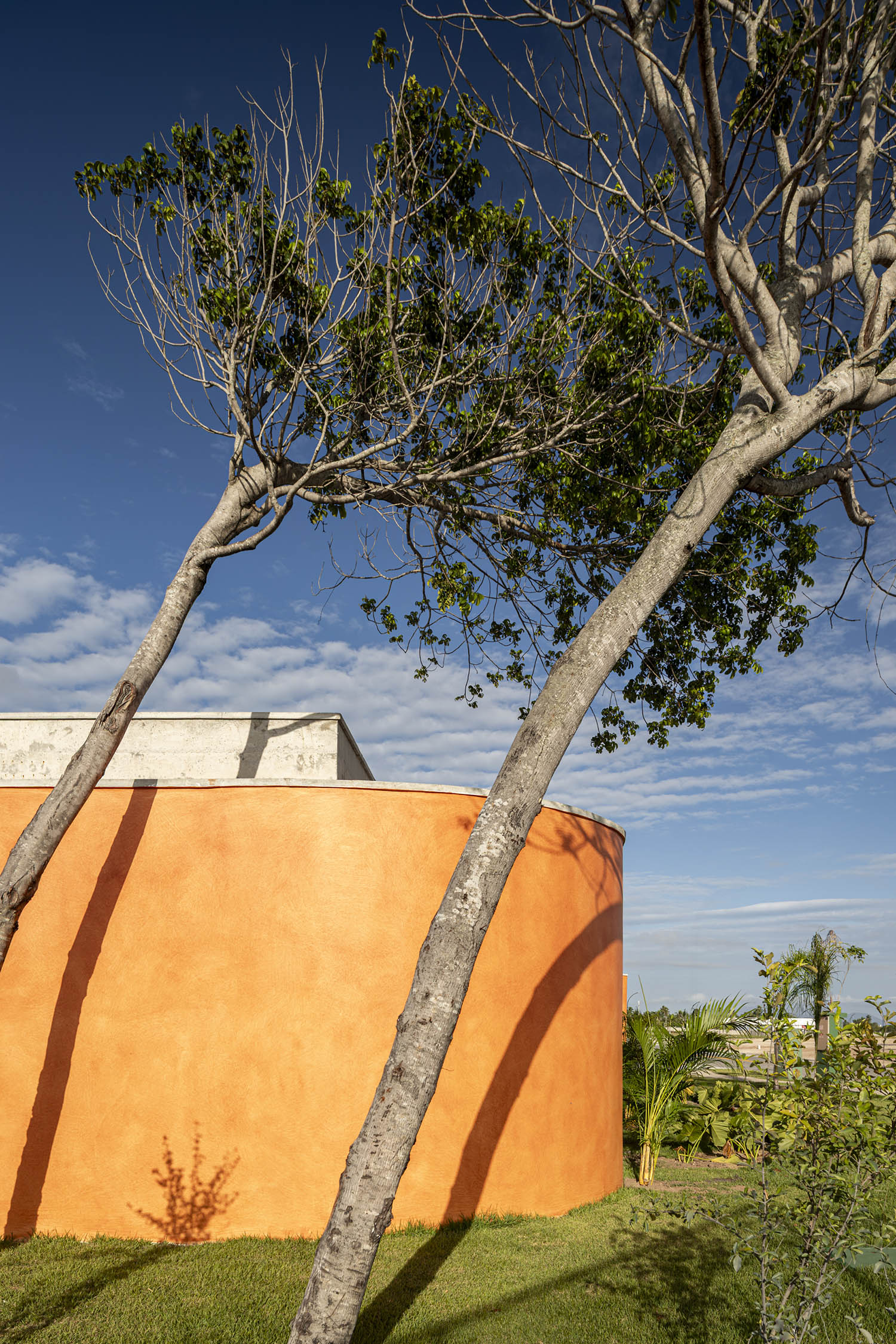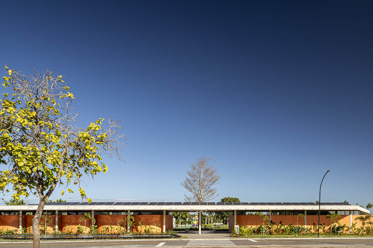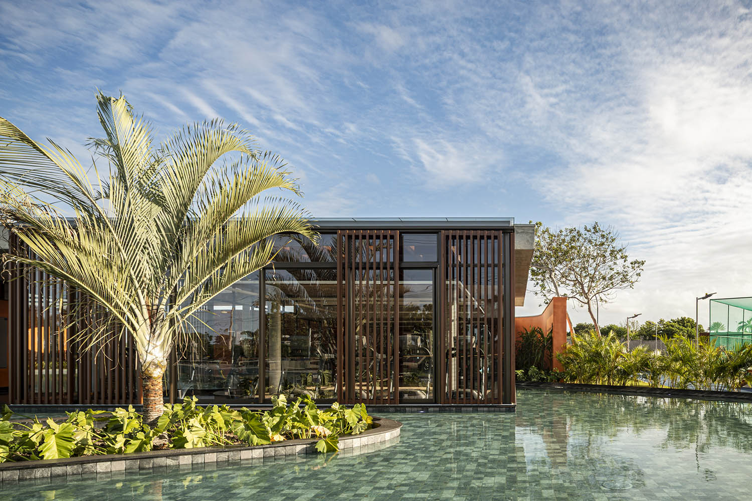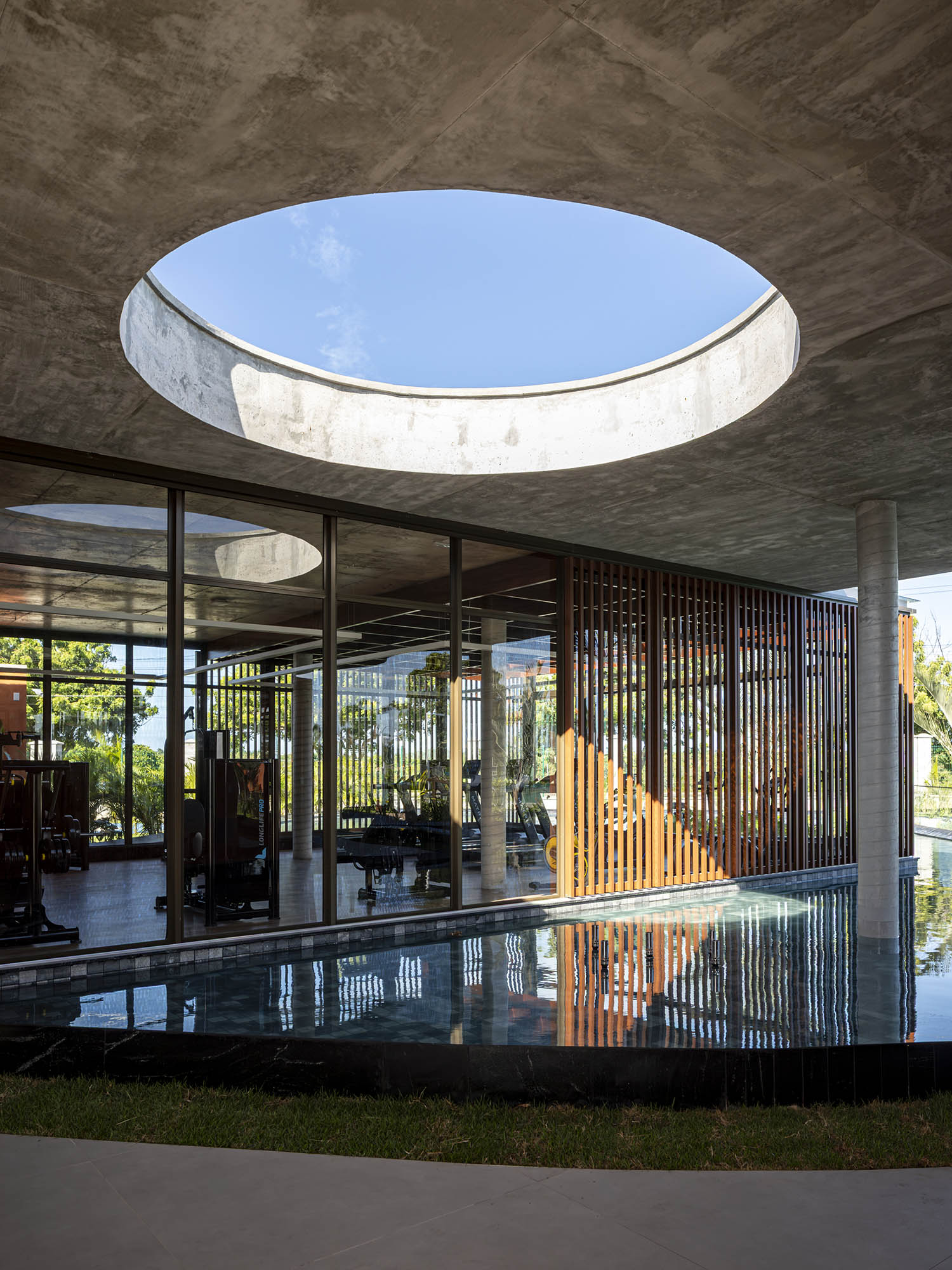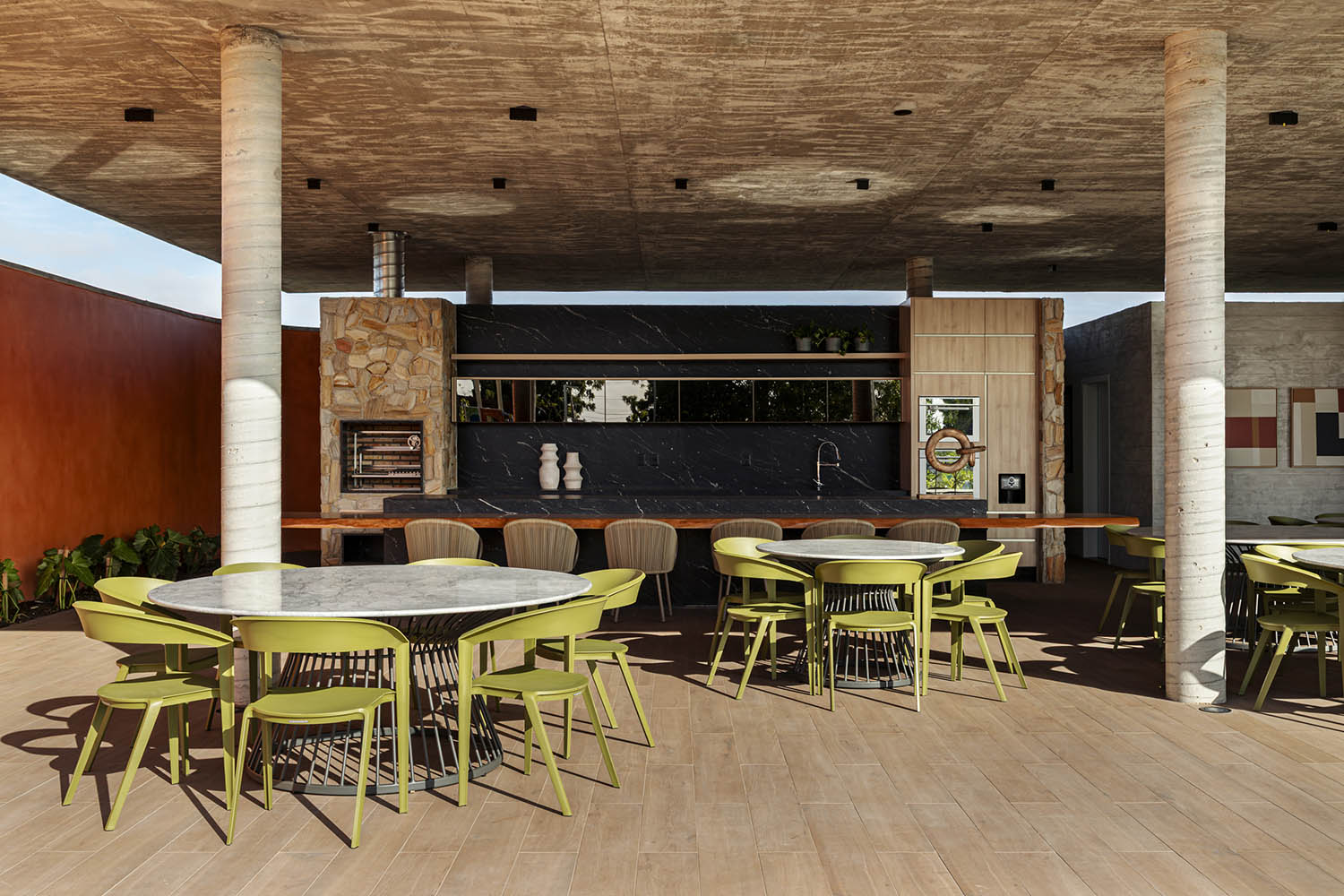 No Clube, a laje ortogonal em concreto aparente é o grande gesto: flutua leve sobre a própria massa. Sob ela, paredes sinuosas costuram os pilares, unindo vedação e estrutura em um movimento contínuo. A cor terrosa reforça a narrativa, evoca o solo nordestino e amplia o vínculo com o entorno.