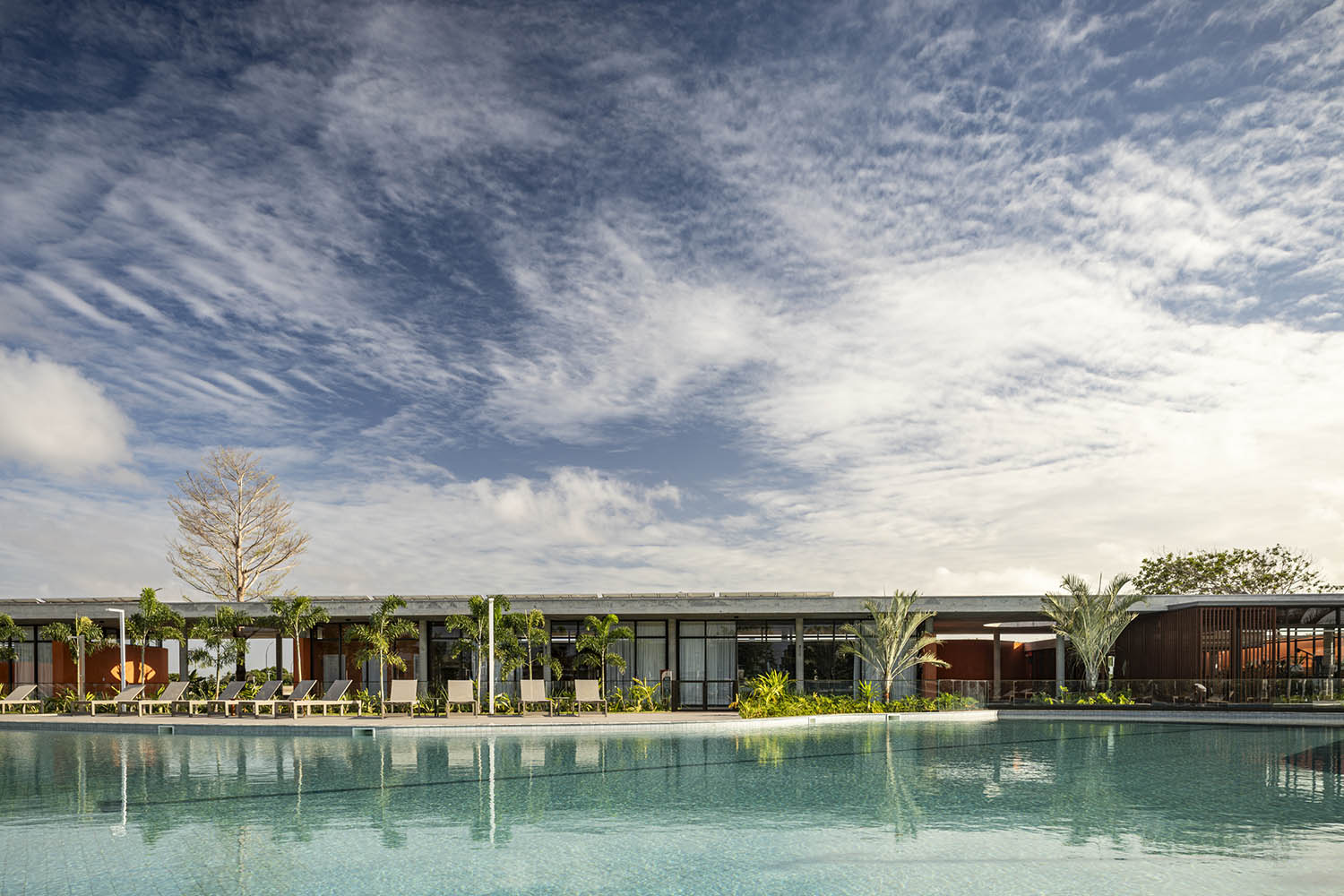 Do outro lado, a arquitetura se abre para a piscina de traços orgânicos, dissolvendo limites físicos e visuais. A transparência integra paisagem e interiores, fundidos numa única experiência de ocupação.