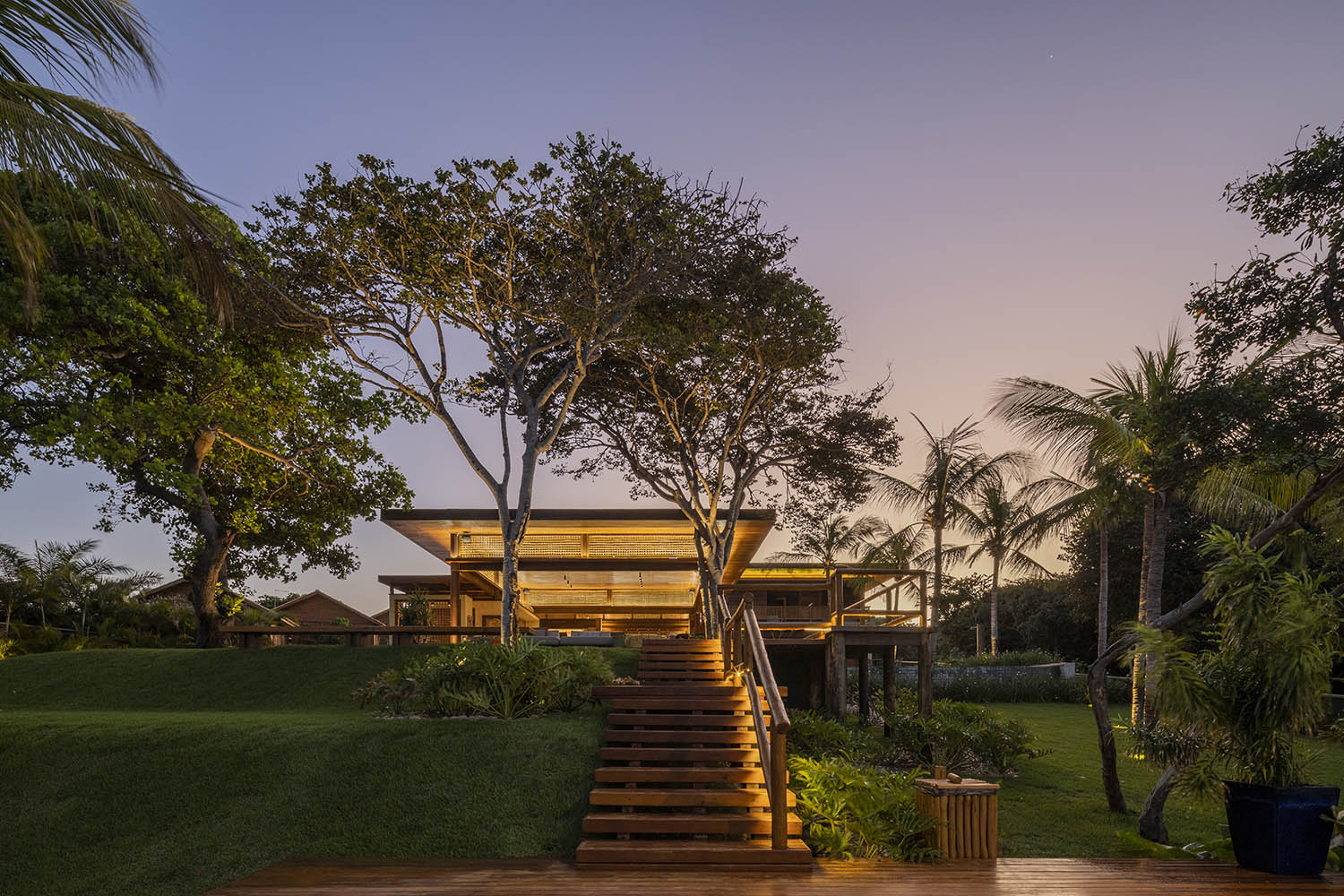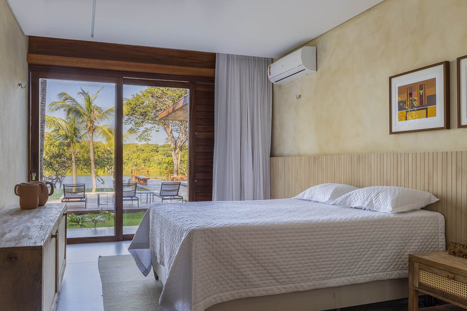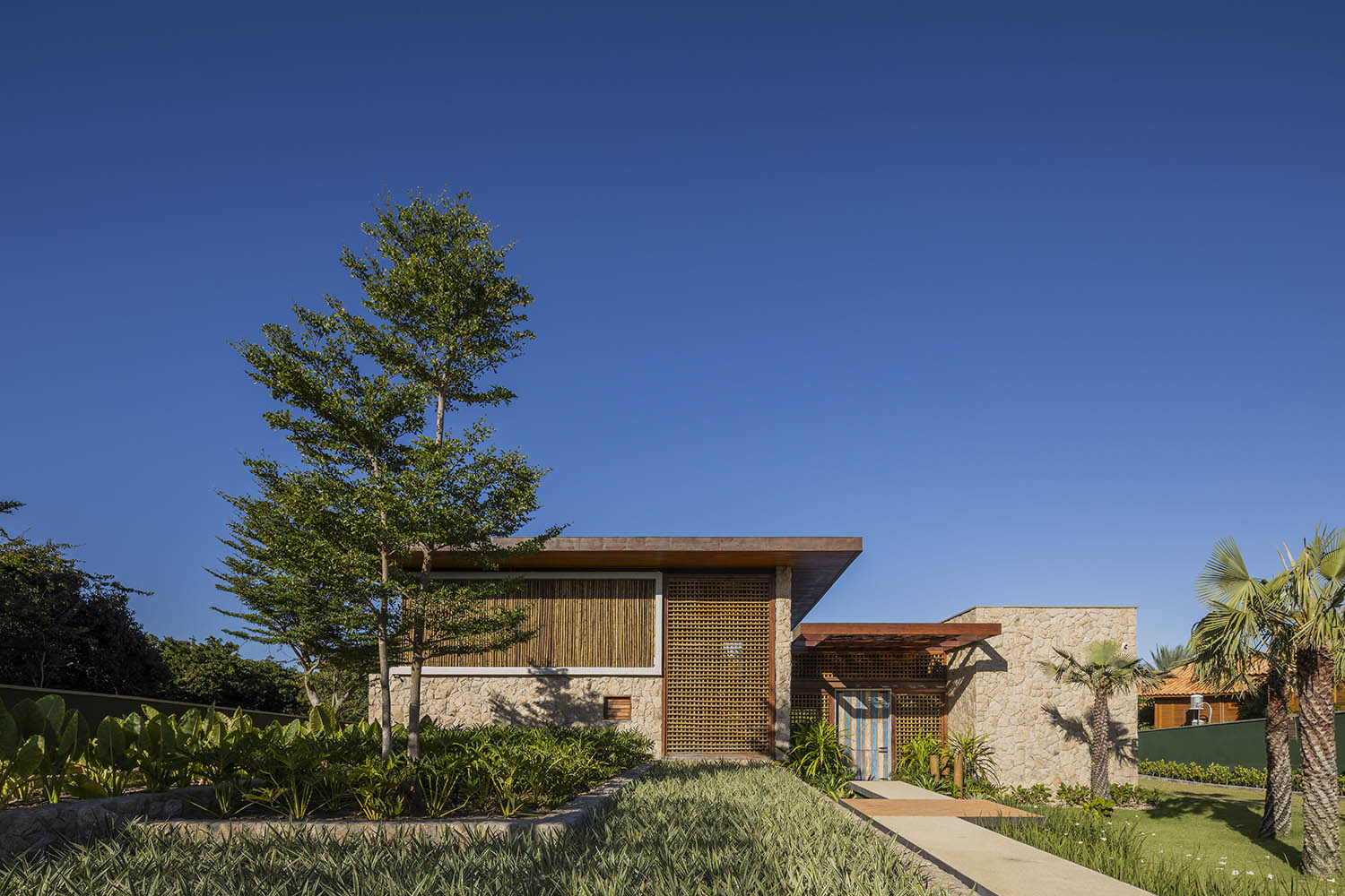A arquitetura se organiza em blocos — social, íntimo e de lazer —, conectados pela paisagem e por fluxos intuitivos. A casa se abre para a Lagoa do Uruaú, ao mesmo tempo em que preserva a privacidade dos ambientes internos.