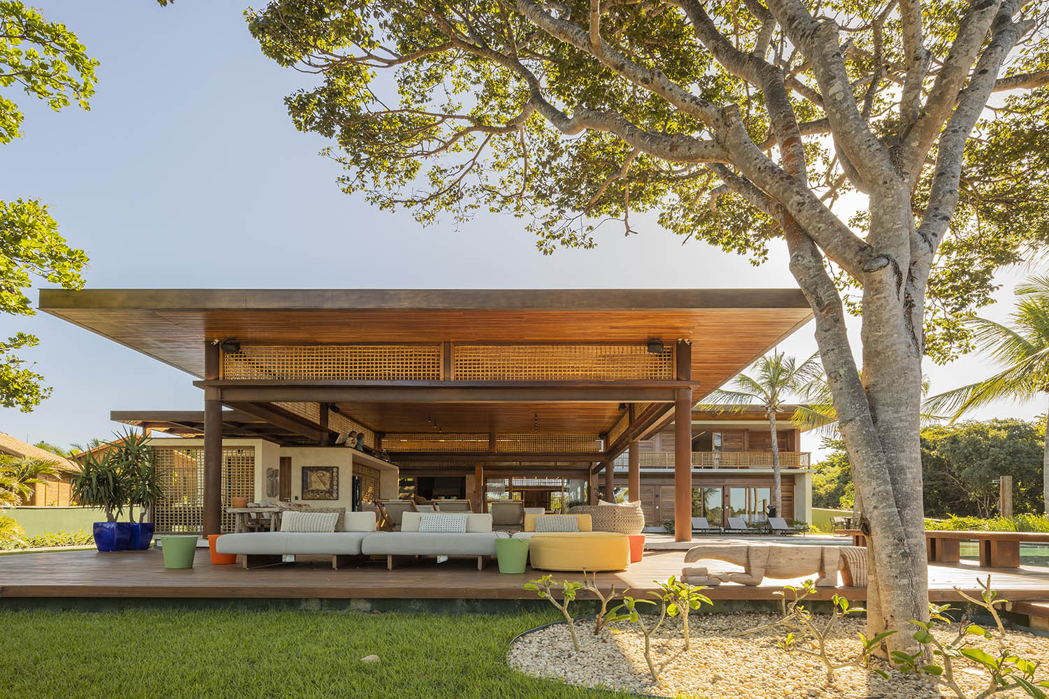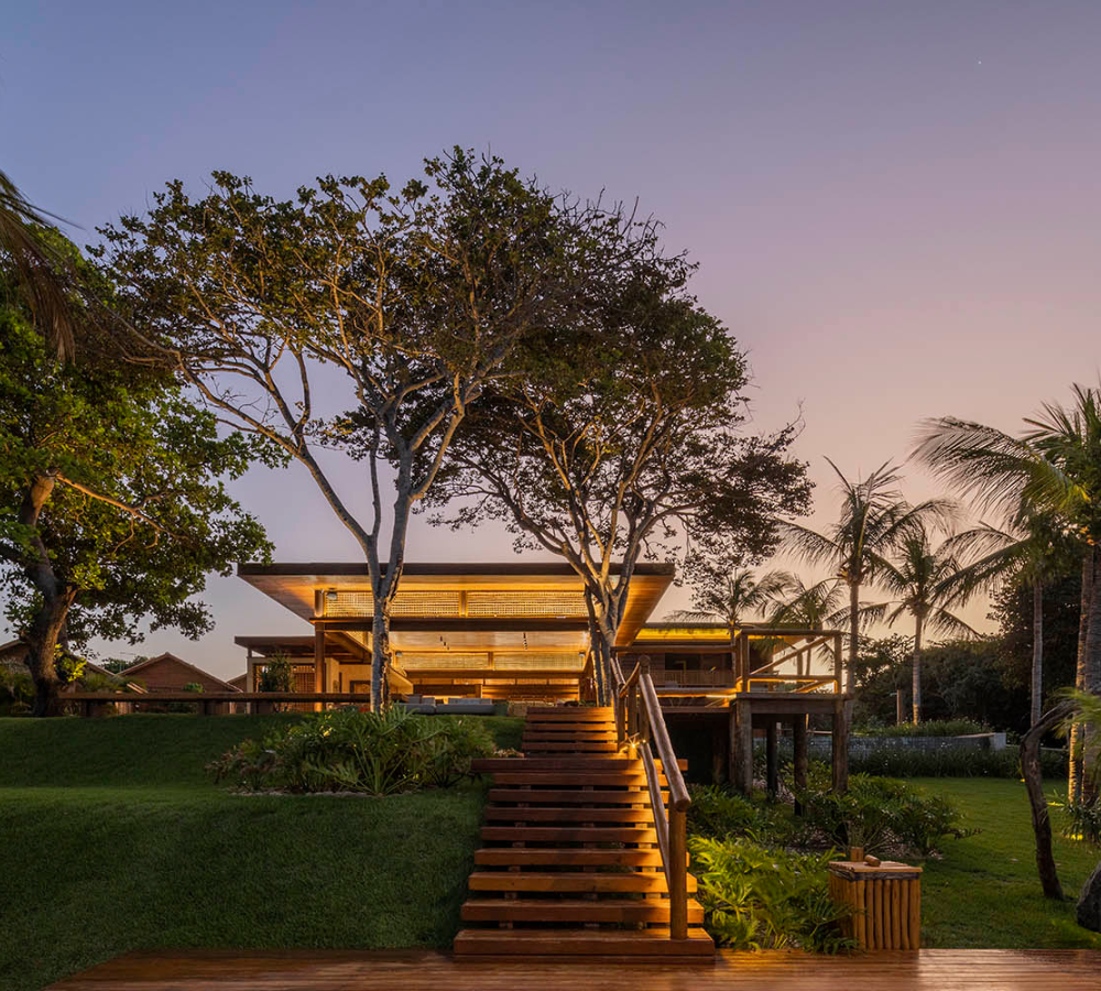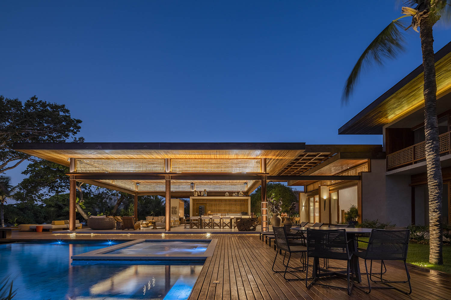 A arquitetura se organiza em blocos — social, íntimo e de lazer —, conectados pela paisagem e por fluxos intuitivos. A casa se abre para a Lagoa do Uruaú, ao mesmo tempo em que preserva a privacidade dos ambientes internos.