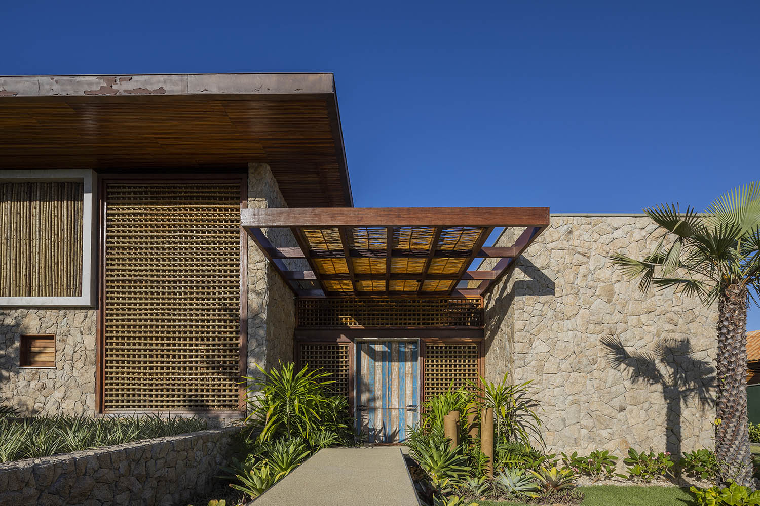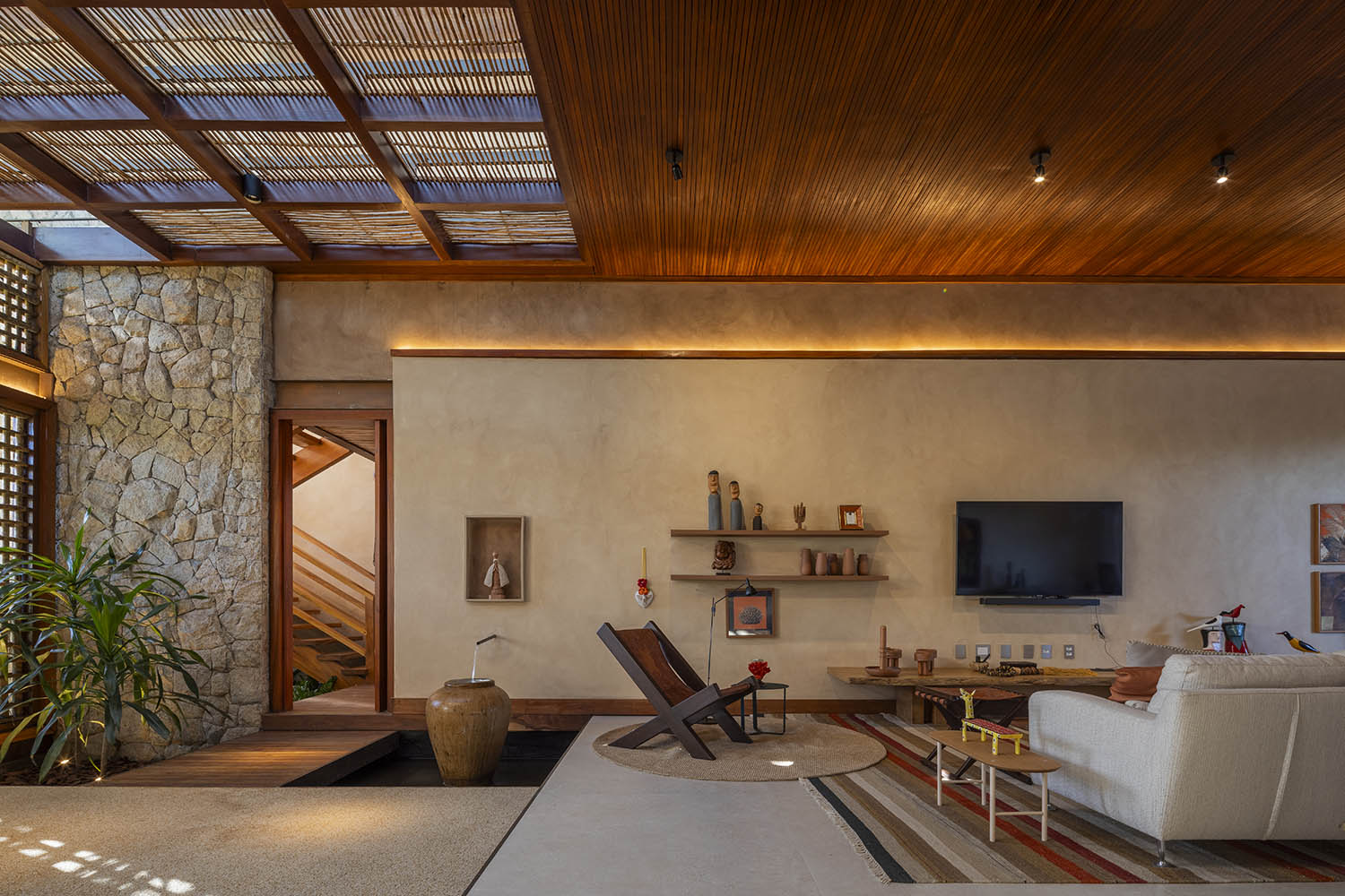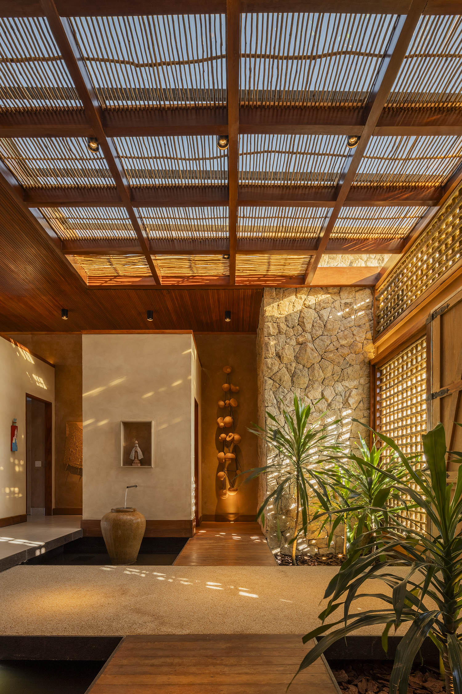 As linhas contemporâneas dialogam com matérias locais: madeira, palhinha, muxarabis e treliças que filtram a luz, trazem conforto térmico e constroem uma relação direta com a cultura do Ceará. As sombras desenham o espaço, criando uma atmosfera em constante transformação.