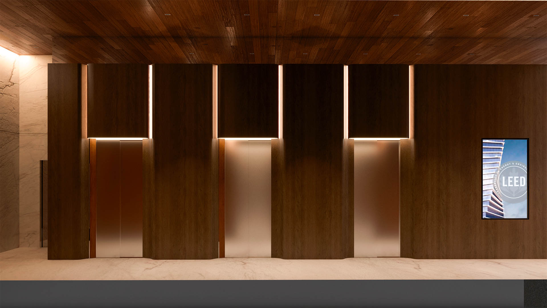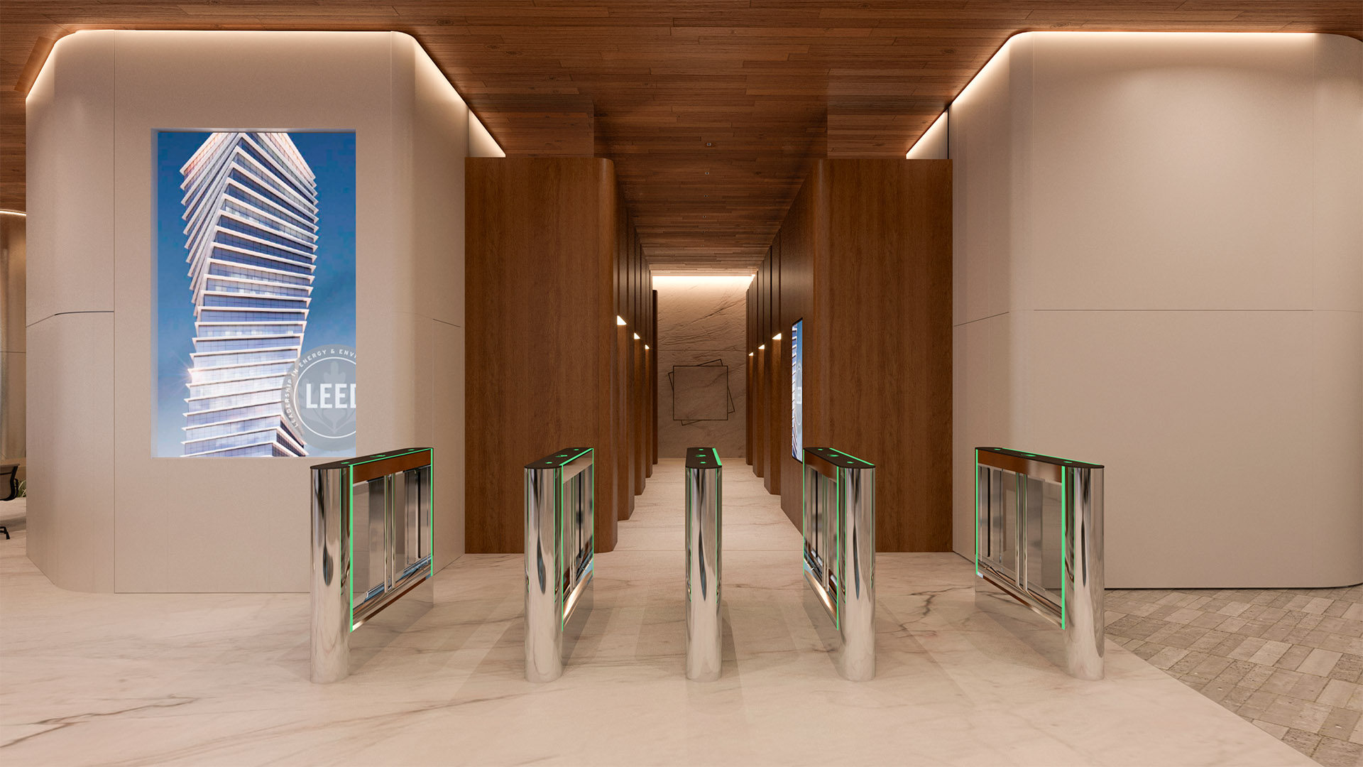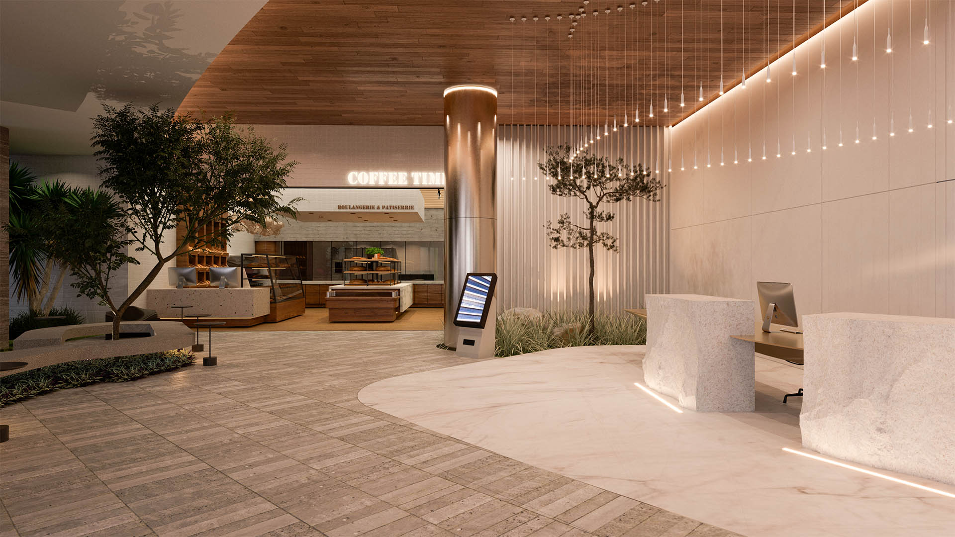 Com o edifício orientado para a esquina, o térreo abriga uma área de convívio aberta à cidade. Propusemos que esse espaço se estendesse para dentro, transformando o lobby em uma continuidade da praça, onde paisagismo e arquitetura se entrelaçam.
